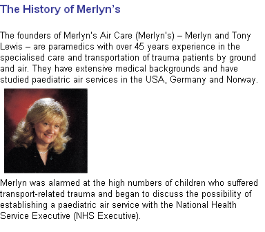 In 1990, after Merlyn saw reports of a seriously ill young boy being transported round the North West by road ambulance (whilst hospitals searched for a bed for him) she began research into the inter-hospital transfer of children throughout the UK.